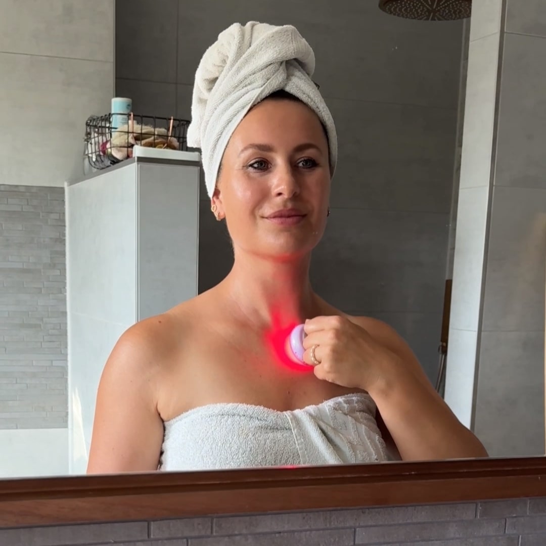 EMS steht für elektrische Muskelstimulation. Sie sendet sanfte Impulse an die Gesichtsmuskulatur und hilft so, die Haut zu straffen und Pflegeprodukte tiefer einziehen zu lassen.