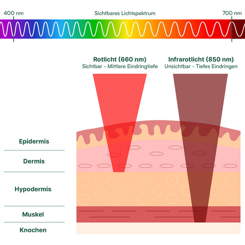 Koanna® LumaTech™ nutzt eine wissenschaftlich fundierte Kombination aus rotem und infrarotem Licht. Beim Auflegen auf die Haut dringen sichtbare rote und unsichtbare infrarote Lichtwellen unterschiedlich tief in das Gewebe ein.